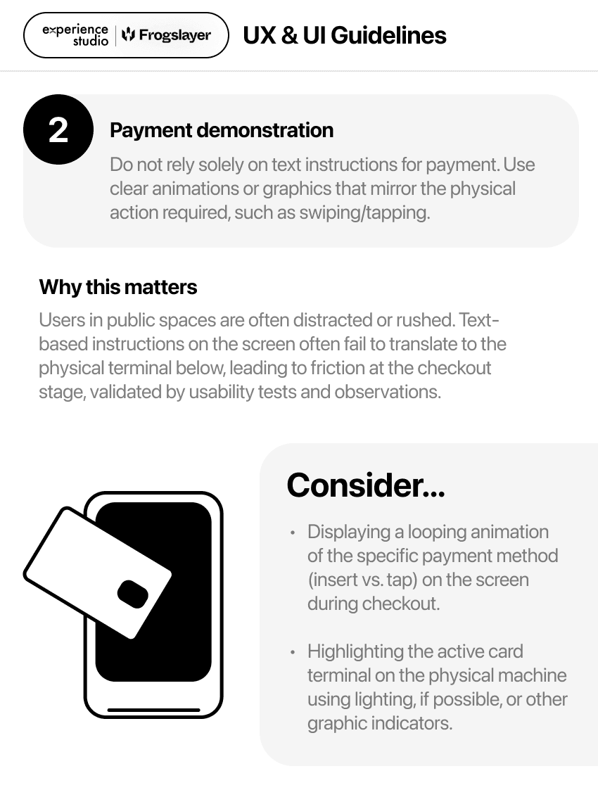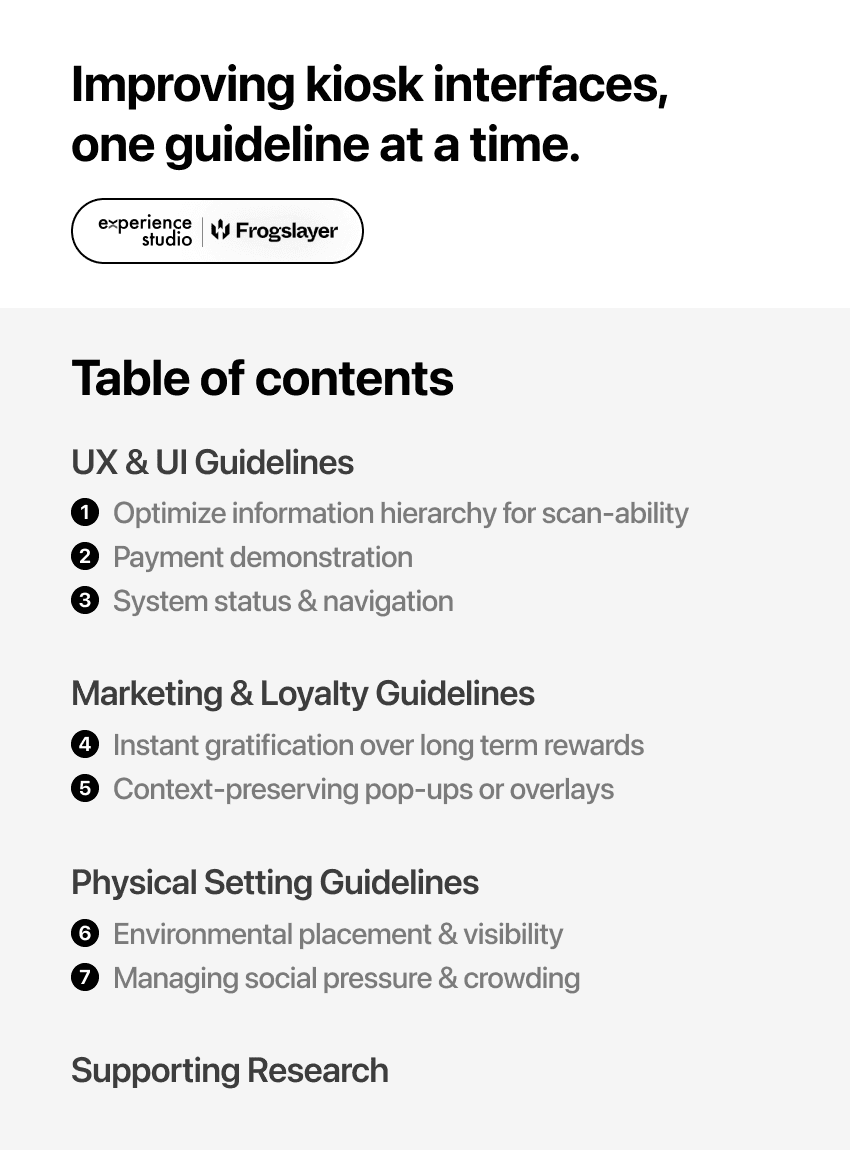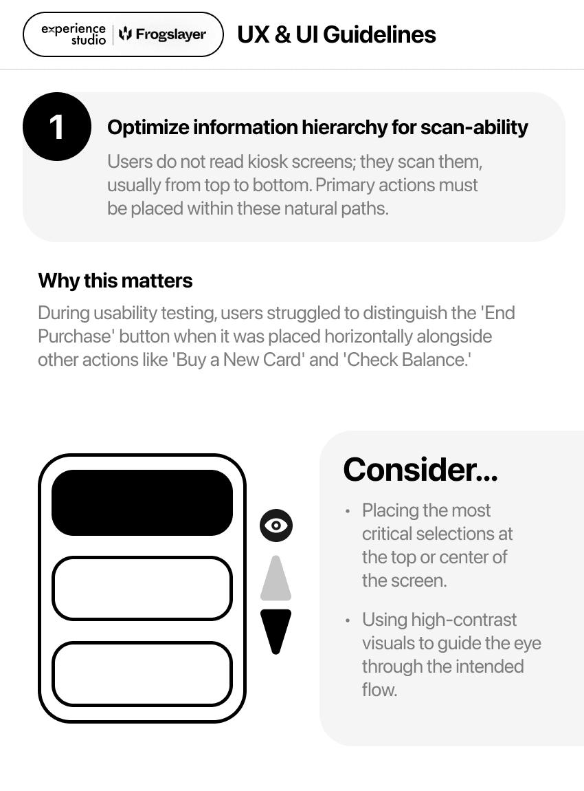 Kiosk interfaces lack standardized design guidelines. Unlike personal devices, they exist in public-facing, distracting environments.