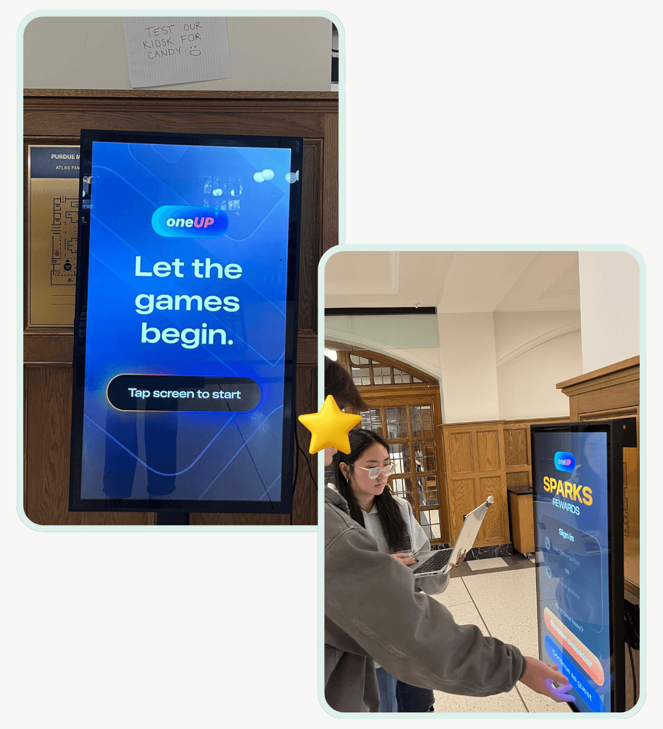 We loaded our prototype onto a 32-inch kiosk monitor provided by Frogslayer and set up shop in the Purdue Memorial Union (PMU - Our Student Center).